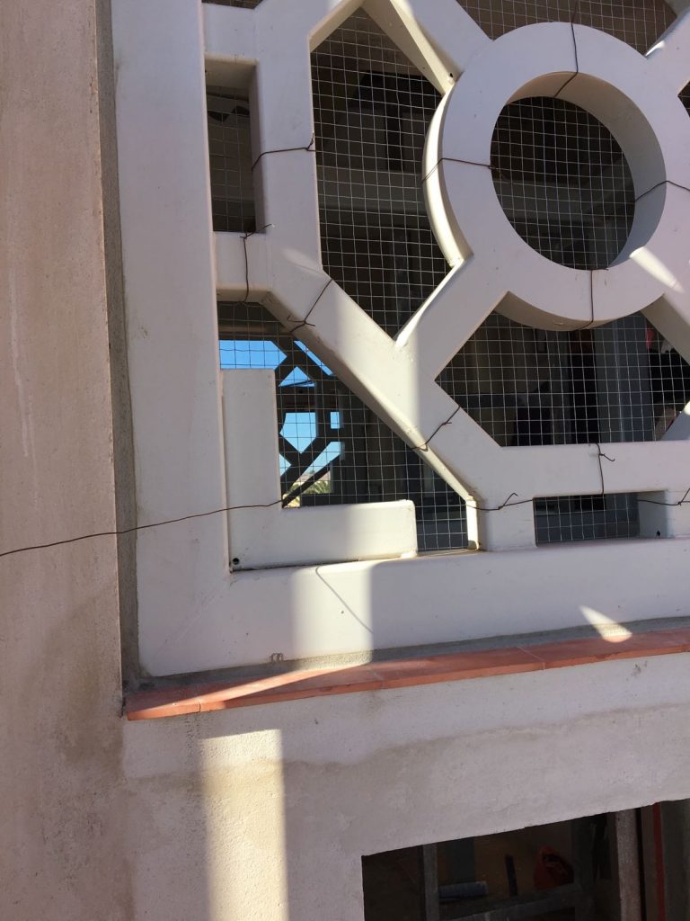 En este sentido, se ha fabricado una réplica, con perfiles tubulares en acero galvanizado, de la celosía decorativa existente en los torreones, con objeto de convertirlo en un elemento estructural que refuerce al conjunto de pilastras sustentantes.