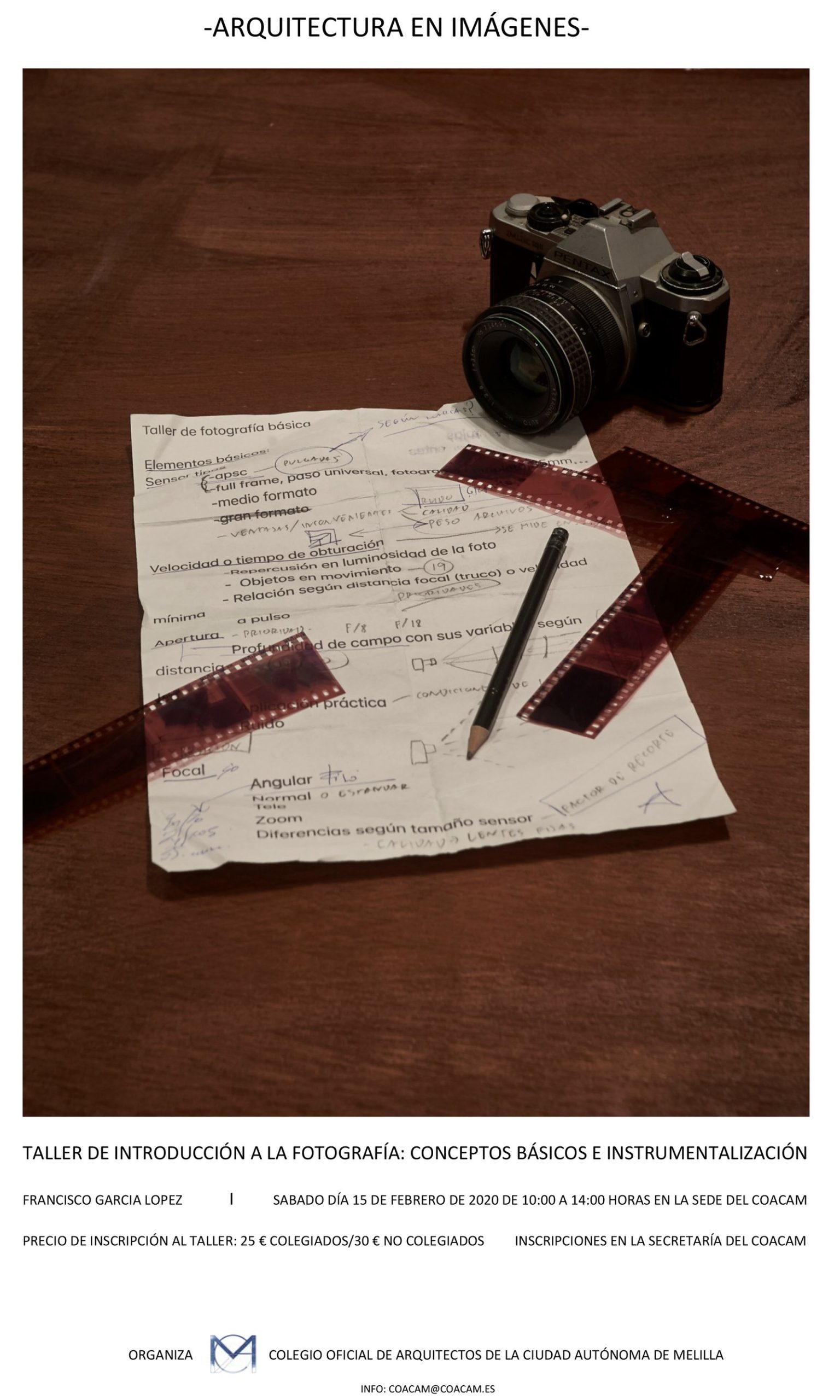 Bajo el título Arquitectura en Imágenes, ponemos en marcha  un taller de introducción a la fotografía, en el que se abordarán conceptos básicos y de instrumentalización para captar imágenes arquitectónicas. La formación, a cargo de Francisco García López, se desarrollará el próximo sábado día 15 de febrero, en horario de 10:00 a 14:00 horas, en la sede del COACAM.  Las inscripciones tendrán un coste de 25€ para colegiados y 30€ para no colegiados, y se formalizarán en la secretaría del COACAM.